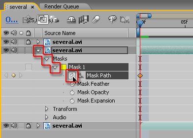 Да, разобраться в таком количестве вершин маски непросто. Но наберемся терпения, ведь настала пора анимировать эту маску. В отличие от прежних версий After Effects, параметр, отвечающий за анимацию маски, теперь называется Mask Path (маршрут, путь) — в ранних версиях программы этот параметр назывался Mask Shape (форма, фигура). Чтобы включить анимирование маски, разверните иерархию параметров дорожки, последовательно пощелкав мышкой по стрелкам, и нажмите кнопку с изображением стрелочных часов. Кнопка утопится, став активной, а на таймлинии автоматически создастся первая ключевая точка — ромб желтого цвета.