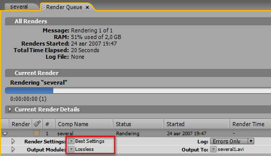 Пора нажимать Ctrl+M. Здесь нежелательно использовать какое-либо сжатие, ведь мы готовили ролик для фильма, который все равно будет впоследствии перекодирован. Оставим все настройки в неприкосновенности, лишь выберем место расположения будущего файла и его имя (пункт Output To), и нажмем кнопку Render.