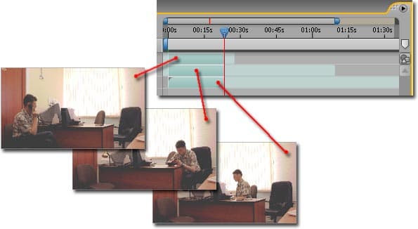 Итак, теперь в вашем распоряжении — непаханое поле деятельности, представляющее собой таймлинию с расположенным на ней видеофайлом. Первая из задач — найти начало и окончание сцены, когда человек в кадре находится в одном (первом) положении. Передвигая ползунок, найдите нужный момент, и, зацепив курсором мышки за левый край клипа (курсор должен приобрести вид двух расходящихся в стороны стрелочек), сдвиньте его вправо, установив границу в месте нахождения ползунка. При этом работу можно упростить, заставив передвигаемую границу «примагничиваться» к ползунку — держите нажатой клавишу Shift.