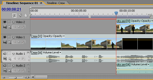 Закончив работу со слоями, продолжите редактирование первой, основной таймлинии перейдите по вкладке Timeline: Sequence 01. На ней по-прежнему находится разрезанный видеоклип. Перетащите его на вторую видеодорожку и удалите левую часть этого клипа, выделив ее и нажав Del. А теперь перетащите из копилки проекта таймлинию с названием "Слои" на первую видеодорожку, поместив ее под оригинальным видео. Осталось подогнать место стыка таймлинии "Слои" и видео так, чтобы окончание движения серии слоев примерно совпадало с началом клипа, расположенного выше.