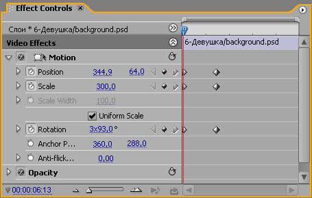 Изменение параметров появления остальных объектов будет зависеть лишь от вашей фантазии, однако не забывайте о способе быстрого клонирования этих параметров. Этот способ не только быстр — он удобен и нагляден. После того, как вы включили запись анимации, нажав кнопку с изображением часов, каждое движение слоя, каждое действие, произведенное над ним, записывается в виде ключевой точки. Точки эти последовательно отображаются в окне Effect Controls - своеобразном подобии таймлинии, где вместо дорожек с клипами — дорожки с эффектами, наложенными на один, выделенный в данный момент, клип. Итак, выберите ключевые точки, которые вы хотите скопировать, обведя мышью вокруг них.