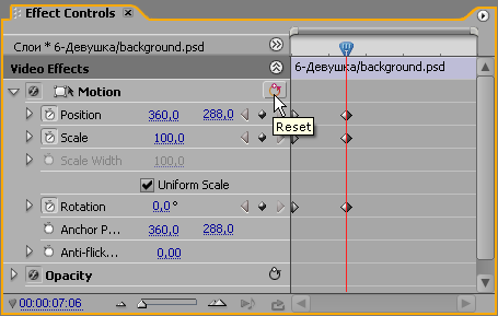 Перейдите на вкладку Effect Controls и последовательно нажмите кнопки с изображением часов у пунктов Position и Scale. Затем передвиньте индикатор времени на несколько кадров вперед — достаточно будет десяти, поскольку клип у нас динамичный, и падать, и появляться каждый объект должен стремительно. А теперь, чтобы восстановить изначальную позицию объекта (какая была сразу после его помещения на таймлинию), нажмите кнопку с пиктограммой стрелки, бегущей по кругу (Reset). Объект сразу окажется на своем прежнем месте — вы можете наблюдать за его поведением в окне Program.