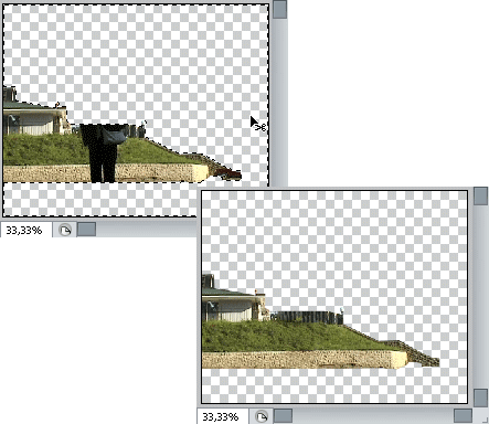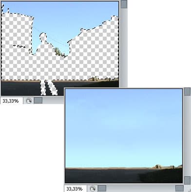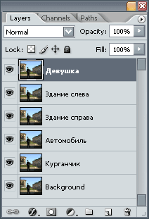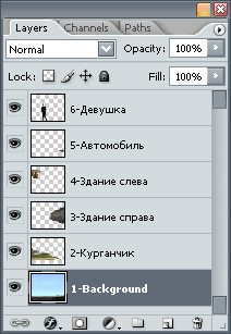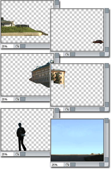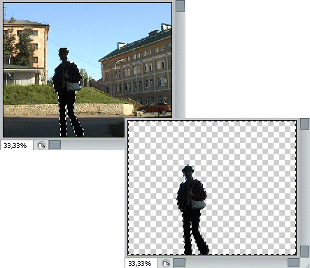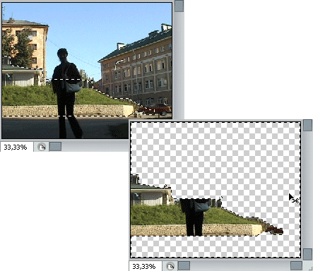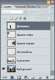 , выделить, "оконтурить" каждый объект и удалить окружающий его фон. Сделайте видимым лишь тот слой, с которым в данный момент хотите работать, щелкнув мышкой в палитре слоев по пиктограмме с глазом, относящейся к выбранному слою, удерживая при этом клавишу Alt, и начинайте выделять объект по контуру. После того, как контур создан, нажмите сочетание клавиш Shift+Ctrl+I - выделение инвертируется, охватив все пространство вокруг объекта. Чтобы удалить этот фон, нажмите Del.