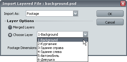 Теперь начинайте импортировать созданный файл background.psd: нажмите Ctrl+I и найдите в открывшемся диалоговом окне ваш рисунок. При импортировании многослойных графических файлов Adobe Premiere Pro предлагает на выбор два действия — импортировать файл, слив все слои воедино, либо выбрать нужный слой. Для этого мы по окончании работы над этим файлом переименовали слои, добавив к их именам цифры: слои отображаются в алфавитном порядке, и теперь гораздо проще выбрать нужный, не запутавшись при большом количестве слоев.