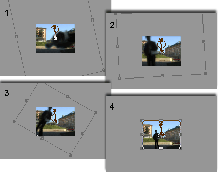 А теперь давайте немного "встряхнем" то, что свалилось с неба ведь, как и положено любому материальному объекту, после падения он не сразу "успокаивается". Более того, объект таких размеров, упав с высоты, наверняка вызовет немалую вибрацию, в том числе и вибрацию камеры. С учетом сказанного, и для того, чтобы падение выглядело как можно более натурально, передвиньте индикатор времени на один кадр вперед и, зацепив мышью слой с объектом в окне Program, слегка подвиньте объект вверх или в сторону. Снова перейдите на один кадр вперед и опять передвиньте слой, но уже в другом направлении. Не забывайте также время от времени изменять размеры рисунка: в том же окне Program зацепите мышью за любой из прямоугольников в углах кадра, и чуть-чуть потяните в сторону, противоположную от центра. Размер кадра изменится, что придаст сцене падения объекта еще больше жизни. Злоупотреблять расстояниями перемещения и степенью увеличения кадра не нужно. Так, в случае со стандартом PAL, наиболее натурально будет выглядеть сцена, когда объект перемещается с амплитудой в 10-15 точек (поскольку в стандартном PAL-кадре по горизонтали насчитывается 720 точек, то и передвигать объект следует, учитывая эти пропорции).
