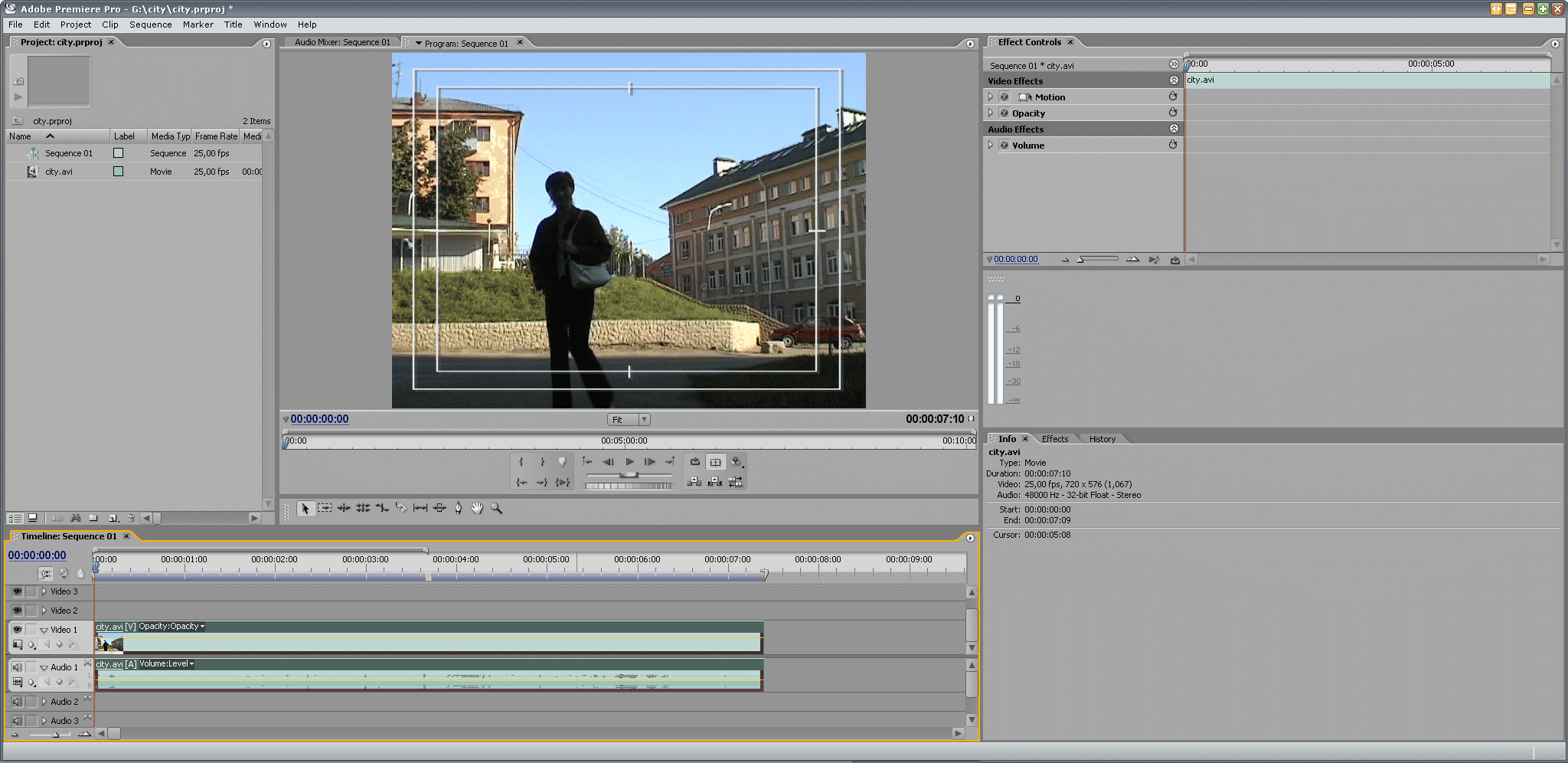Запустите Adobe Premiere Pro 2.0 и создайте новый проект с теми установками, которые вам наиболее всего подходят. Поместите видео, над которым вы хотите работать, на таймлинии. Поскольку видео, скорее всего, снималось «с рук» — оно наверняка имеет знакомые всем артефакты, по сути, являющиеся всего лишь особенностью интерлейсного видео. Проявляется такая особенность всегда одинаково: границы двигающихся в кадре предметов имеют вид расчески. Это совершенно нормальная ситуация, и не пытайтесь ее исправить, ведь данное видео предназначено для просмотра на телевизоре.