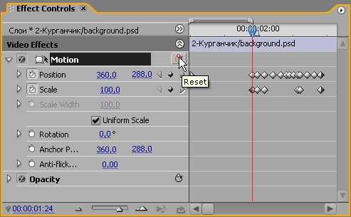 В этом случае достаточно будет двух серий ключевых точек. Переместите курсор времени немного вперед менее чем на секунду, и нажмите знакомую вам кнопку Reset для сброса всех параметров.