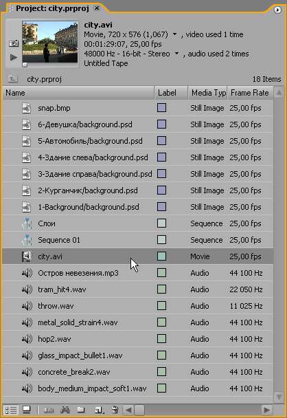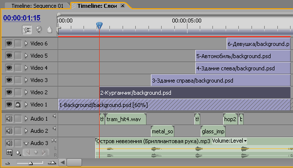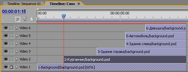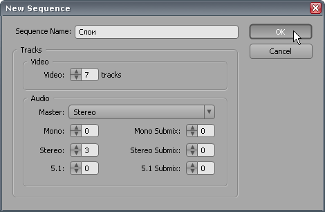 Импортируйте поочередно все слои документа, после чего создайте новую таймлинию (Sequence) и назовите ее как угодно, например, «Слои». Новая таймлиния в нашем случае должна содержать не менее шести видеотреков и хотя бы три аудиотрека.