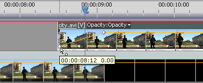 Вдобавок, чтобы некоторые мелкие огрехи не бросались в глаза, можно сделать появление видео постепенным через изменение его прозрачности: просто добавьте пару ключевых точек в начале клипа, уведя первую точку вниз.