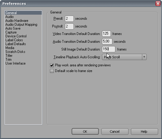 Зайдите в настройки Adobe Premiere Pro 2.0, выбрав пункт меню Edit->Preferences->General. Выставьте значение длительности рисунков, равное 150 кадрам (при 25 кадрах в секунду это составит 6 секунд, что вполне достаточно для короткой заставки).