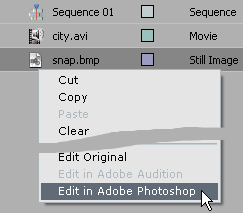 В окне проекта появится созданный файл, нажмите на нем правой кнопкой мыши и выберите из выпадающего меню самый нижний пункт: Edit in Adobe Photoshop.