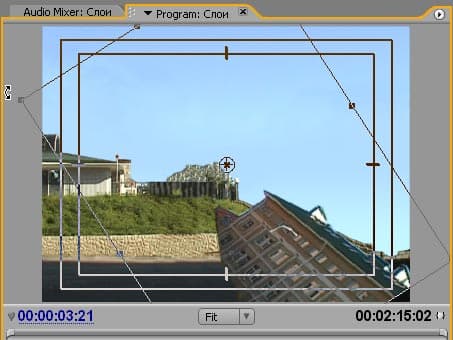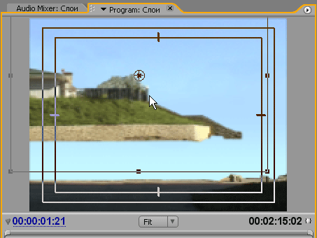 Каждый импортированный рисунок, помещенный на таймлинию, занимает в кадре свое исходное, «правильное» положение — ведь данный рисунок полностью соответствует размерам кадра. Нам необходимо вывести эти объекты за пределы кадра. Для этого выделите видеоклип, находящийся на второй видеодорожке (кстати, первую дорожку, где находится фон, лучше всего сразу заблокировать от случайного изменения), клавишами Page Up/Page Down переместите курсор времени на самое начало выделенного клипа. Теперь, при выделенной второй дорожке, в окне Program мышью переместите объект, принадлежащий выделенному рисунку, в самый левый верхний угол рабочей области, так, чтобы он полностью исчез из кадра.