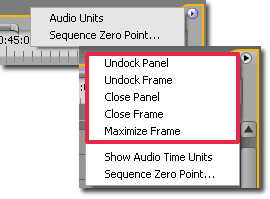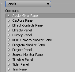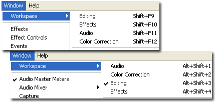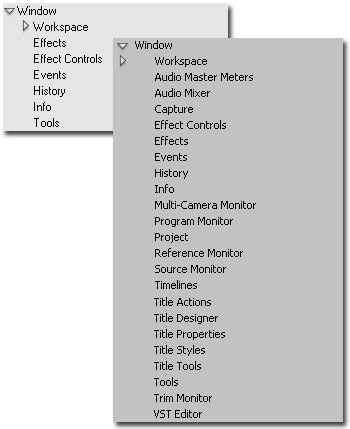 Упразднена команда DVD Layouts, зато добавлены пункты вызова палитр Capture, Multi-Camera Monitor, Reference Monitor, Trim Monitor, VST Editor. По поводу пункта Capture: не совсем ясен смысл появления этой команды, она полностью дублирует File>Capture (F5). Палитра VST Editor может быть встроена в общий интерфейс программы, а также может содержать большое количество закладок с окнами настроек VST (Virtual Studio Technology) эффектов, что было недоступно в версии Adobe Premiere Pro 2.0.