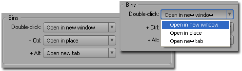 Есть возможность изменить порядок действий при двойном клике мышью по папке в панели Project: выполните команду Edit>Preferences>General, и в новом разделе Bins выберите из выпадающего списка любой понравившийся пункт. По умолчанию здесь установлен следующий порядок: