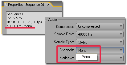 А вот и очередная досада: ко всем неурядицам добавились еще и ограничения Beta-версии программы, а именно: у вложенной последовательности звуковая дорожка моно. Те же ограничения существуют и на экспорт звука, здесь доступен только пункт Mono.
