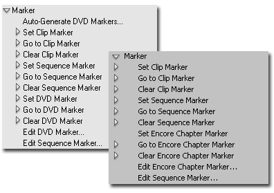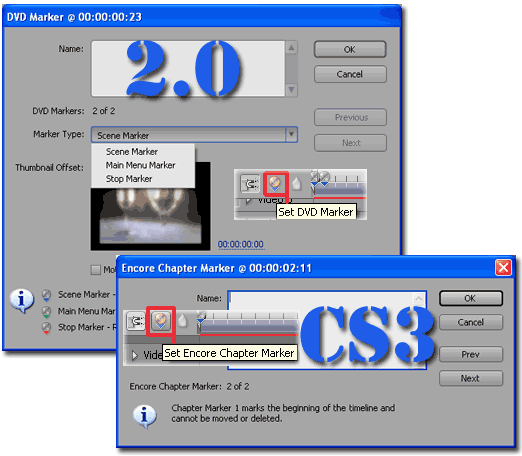 Изменилось роль DVD маркера, а также окно его настроек. Теперь это просто маркер Encore Chapter, и он имеет один цвет синий. Также упразднена команда Auto Generate DVD Markers, которая автоматически расставляла маркеры по заданным параметрам. Видимо, разработчики не захотели дублировать аналогичную команду, существующую в Encore DVD: Timeline>Add Chapter Points at Intervals.