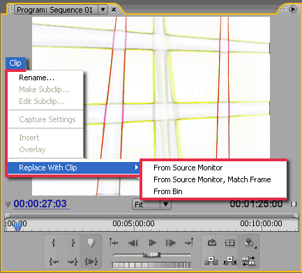 Есть несколько способов замены клипа на таймлинии без потери предыдущих настроек. Так, можно заменить клип из папки в панели Project, или из окна источника (Source Monitor). Например, выделим клип в списке панели Project, а теперь щелкнем по клипу на таймлинии. Выполним команду Clip>Replace With Clip>From Bin - и пожалуйста, на таймлинии оказался клип, выбранный в окне проекта! Еще проще: зацепим клип в списке панели Project, и, удерживая клавишу Alt, бросим его на целевой клип на таймлинии. Операция с клавишей Alt справедлива и для окна источника Source Monitor.