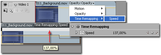 Простой пример: нажимаем правую кнопку мыши на заголовке файла, и выбираем из списка пункт Time Remapping>Speed. Теперь захватим курсором мыши появившуюся направляющую оранжевого цвета, и тянем ее вверх или вниз, в зависимости от того, хотим мы увеличить либо уменьшить скорость клипа. Ничего сложного: вверх - быстрее, вниз - медленнее. Соответственно, и продолжительность клипа будет изменяться в зависимости от выбранного вами режима.