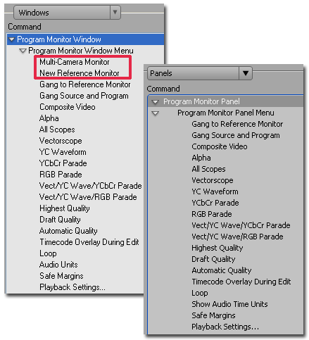 Команды по вызову палитр Multi-Camera Monitor и New Reference Monitor (в CS3 Reference Monitor) были перенесены в закладку Application>Window.