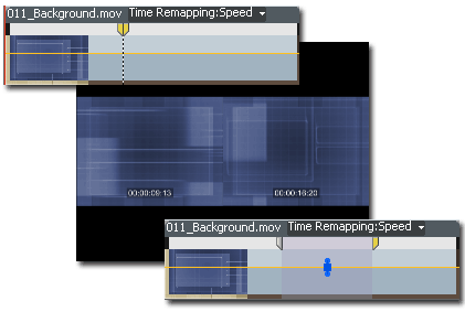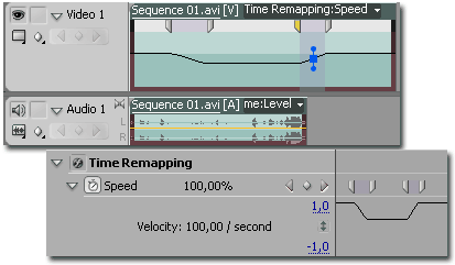 Второй маркер необходимо установить в месте, где скорость клипа должна вернуться к нормальной, после чего стоит лишь потянуть направляющую между полученными точками вверх или вниз, как скорость клипа на этом отрезке станет плавно меняться в зависимости от выбранного направления. Следует иметь в виду: при работе с Time Remapping звук клипа автоматически разъединяется с видео, скорость проигрывания звука при этом остается неизменной.