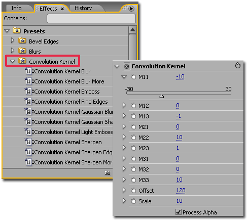Появилась новая папка с пресетами Effects>Presets>Convolution Kernel. Действие эффекта Convolution Kernel несложно: кадр попросту делится на ячейки. Каждая ячейка, находящаяся в сетке, может регулироваться отдельно.