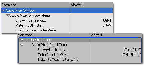 Изменились комбинации клавиш, “зашитых” в закладке Audio Mixer Panel (Window) Menu.