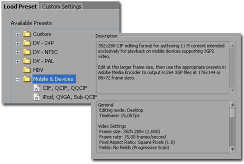 В списке Available Presets (доступных предустановок) появилась новая папка Mobile & Devices. Компания Adobe не хочет обижать армию пользователей портативных устройств, и внедрила поддержку мобильных форматов в программу Adobe Premiere Pro CS3. Не совсем понятно, к чему нужен импорт данных форматов в этом профессиональном видеоредакторе: для домашних пользователей уже существует Adobe Premiere Elements.