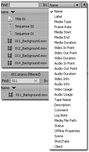 Добавлен ряд новых возможностей в Project Panel, и первое, что обращает на себя внимание - это сервис Find. Поиск можно осуществлять по ошеломляющему количеству параметров. Например: вбиваем имя файла в поле Find, и получаем в списке искомый файл. Для возврата к исходному состоянию отображения списка клипов достаточно нажать значок Х в поле Find.