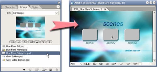 В Adobe Encore можно создавать не только статичные меню, но и анимированные. Для этого в окне проекта необходимо выделить текущее меню, и на вкладке свойств выставить флажок "Animate Buttons" (Анимировать кнопки). Кроме того, на этой же вкладке можно определить время проигрывания клипа, количество проигрываний и другие параметры.