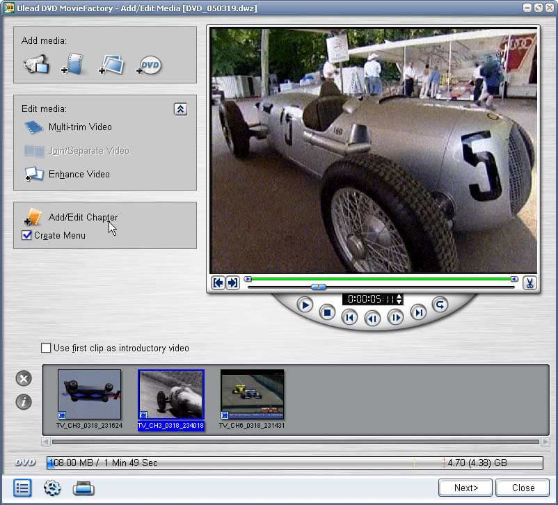 В отличие от Movie Factory переход к различным этапам создания DVD осуществляется закладками, расположенными в левой верхней части рабочей области. В проект можно добавить видео любого формата (продукты от Ulead вообще непритязательны в этом отношении). Также можно воспользоваться модулем захвата видео - почти точной копией аналогичного модуля MovieFactory. Доступны: резка и склейка видеофрагментов, добавление фонового звука, добавление субтитров (с полной поддержкой русского языка), которые можно ввести вручную для любого участка видео, или импортировать из текстового файла. Разбиение видеофрагментов на главы производится как вручную, так и автоматически путем сканирования видео. Следует отметить высокое качество работы модуля сканирования - места смены сцен в видеофрагменте с аналогового источника определяются безукоризненно точно и быстро.