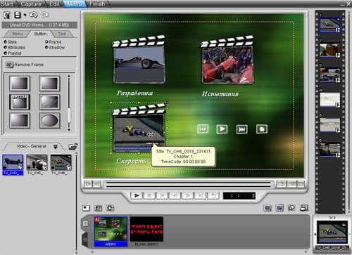 Процесс создания DVD в данной программе несложен: после импорта в новый проект готовых файлов они скапливаются в окне проекта, откуда их можно перетащить на тайм-линию и определить местонахождение chapters (глав). К этим главам в будущем можно будет "привязать" любой объект меню, который вы создадите. Чтобы определить местонахождение очередной главы, достаточно перетащить ползунок в нужное место клипа на тайм-линии и нажать кнопку "Add chapter"
