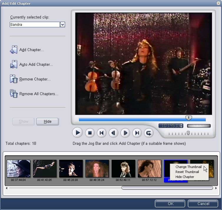 Все как обычно - остановив ползунок в нужном месте клипа и нажав кнопку "Add Chapter", мы добавляем на тайм-линию очередную главу. В данном случае было создано 18 глав, совпадающих с началом каждой песни. Пиктограмму каждой главы можно изменить, перетащив ползунок в нужное место клипа и выбрав из контекстного меню команду "Change Thumbnail". Теперь, когда главы расставлены, в главном окне программы перейдем по кнопке "Next" в окно создания меню DVD.