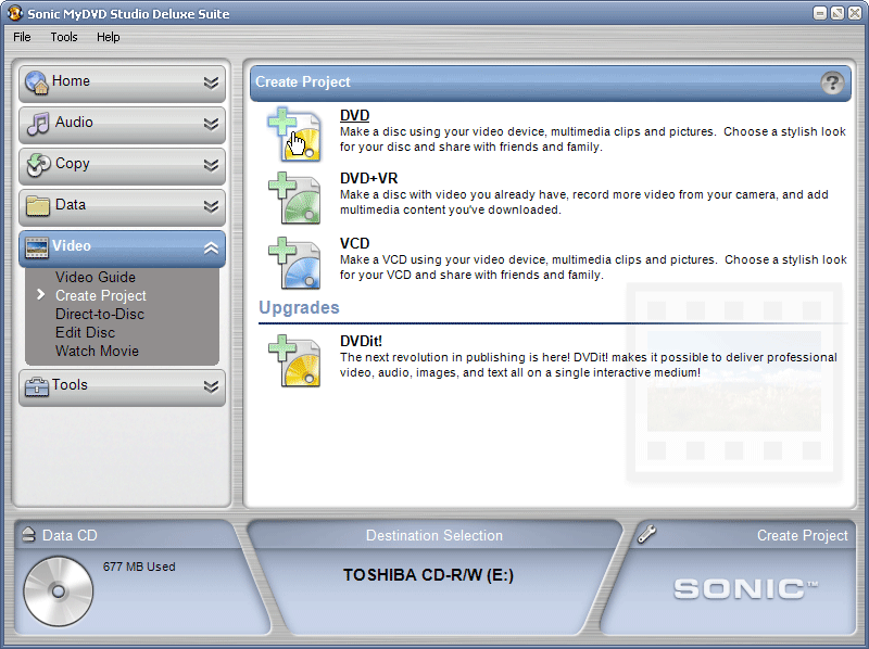 Данная программа входит в состав пакета, носящего название MyDVD Studio Deluxe Suite. Возможности пакета включают все, что может понадобиться владельцу домашнего компьютера - от копирования музыки с Audio CD и прожига дисков с данными до создания DVD диска и печати наклеек. Присутствует даже такая экзотическая для мультимедийных приложений функция, как резервное архивирование файлов и запись их на DVD (раздел Data).