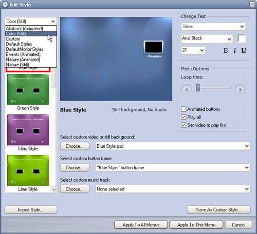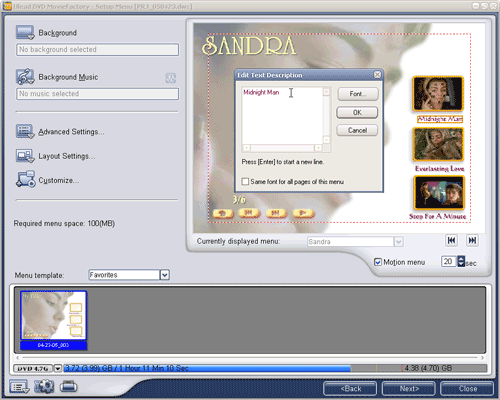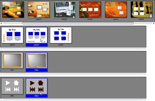 Предлагаемых на выбор шаблонов явно недостаточно (см. рисунки ниже), однако этот недостаток частично компенсируется появившейся в Ulead DVD Movie Factory 4 возможностью их редактирования. Частично - потому, что возможность редактирования свелась лишь к изменению размеров и положения объектов. Однако это новшество дарит пользователю определенную свободу, особенно если учесть столь небольшое количество шаблонов размещения объектов. К счастью, разработчики предоставляют возможность бесплатно скачать дополнительные шаблоны с сайта компании.