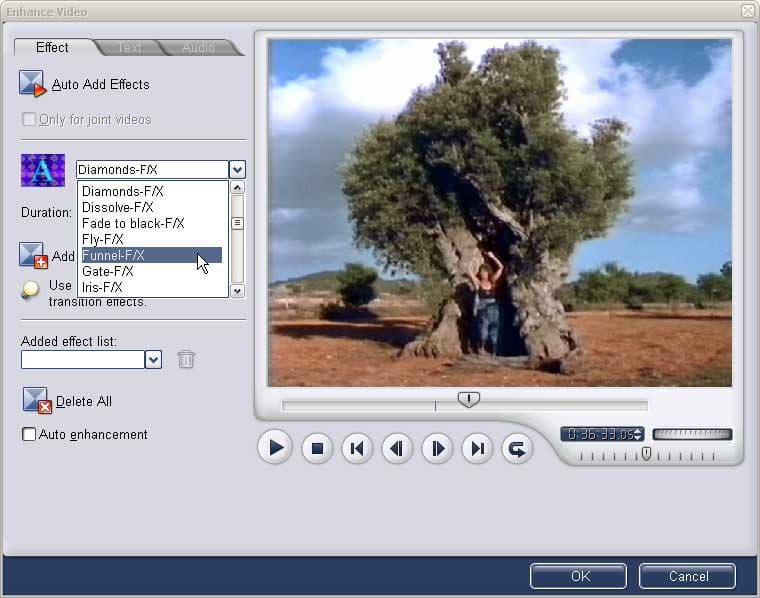 Здесь к видео можно добавить переходы (доступны 114 заготовок), текст (русский поддерживается) или звук (готовый файл, либо путем захвата с микрофона). Опция "Auto enhancement" работает аналогично фильтрам Auto Levels, Auto Contrast и Auto Color от Adobe, значительно улучшая качество картинки и делая ее более сочной.