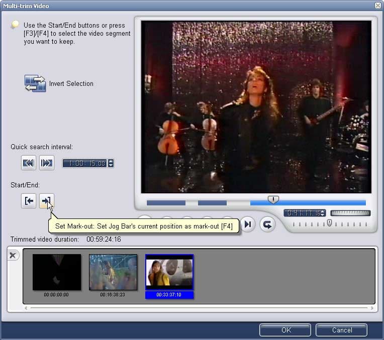 Чтобы вырезать из клипа сцены, лишние в создаваемом DVD, достаточно отметить их начальную и конечную точки. Выделенные отрезки видео окрашиваются в синий цвет и автоматически попадают на тайм-линию в виде отдельных клипов. Не закрашенные области видео при этом просто не будут отображаться при проигрывании клипа, но в то же время "физически" останутся на месте.