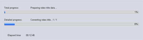 Следующий этап в нашей работе - прожиг DVD. Кроме этого, существует возможность создать образ диска, либо каталоги с файлами DVD. К сожалению, в новой версии пакета механизм обсчета видео явно перенял медлительность у своего младшего собрата - на рисунке видно, что рендеринг 1% DVD занял более 12 минут.