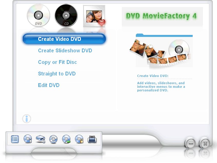 По сравнению с предыдущей версией рассматриваемого пакета, интерфейс DVD Movie Factory претерпел незначительные изменения, да и те касаются лишь оформления программы. Рабочее пространство несколько увеличилось, но у него по-прежнему остался фиксированный размер: его невозможно изменить привычным перетаскиванием границы окна. Сам пакет остался выполненным в виде мастера, поэтапно проводящего нас через весь процесс авторинга. В первой части мастера по-прежнему доступны следующие операции: