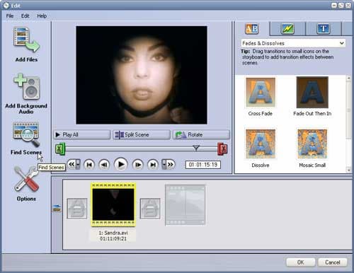 Модуль Edit позволяет добавить в проект файлы поддерживаемых программой форматов. Это могут быть изображения, видео, звук. Отдельные клипы можно объединить или создать между ними переходы. Доступно 86 заготовленных переходов, сгруппированных по типу.
