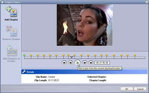 Закончив с редактированием видео, можно перейти к не менее важной части DVD-проекта: определению глав. Месторасположение их определяется ползунком, и фиксируется нажатием на кнопку Add Chapter. По нажатии кнопки OK расставленные главы будут автоматически добавлены в проект.