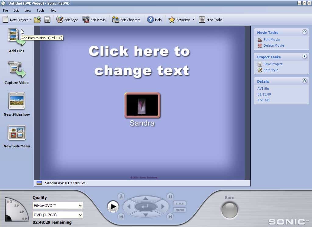 Если предыдущая версия Sonic MyDVD в финале работы позволяла лишь прожечь диск, то теперь существует возможность создания образа диска, либо каталогов с файлами DVD. Подготовка к прожигу происходит гораздо быстрее, чем в пакете от Ulead. Так, обсчет текущего проекта продолжительностью 1 час 11 минут и объемом 4,51 Гб занял около часа.