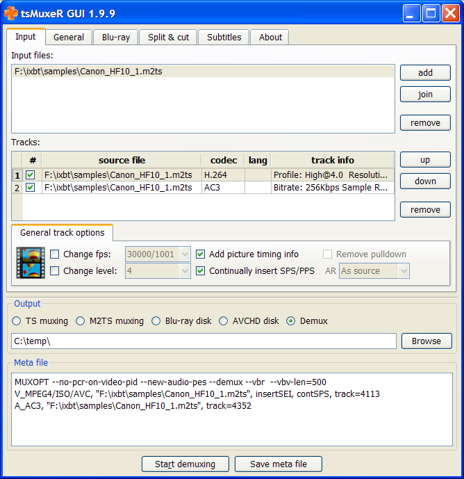 Еще ниже показан список выходных форматов для сохранения результата: TS, M2TS, BluRay, AVCHD, Demux. Первые два это сохранение результата в файл с форматом контейнера MPEG2 Transport Stream. Формат M2TS соответствует формату контейнера AVCHD-видеокамер. По информации от автора программы, M2TS имеет по сравнению с форматом TS дополнительный 4-байтовый заголовок перед основным 188-байтовым TS-фреймом. Таким образом, размер фрейма становится 192 байта. M2TS также используется в AVCHD и Blu-Ray-дисках.