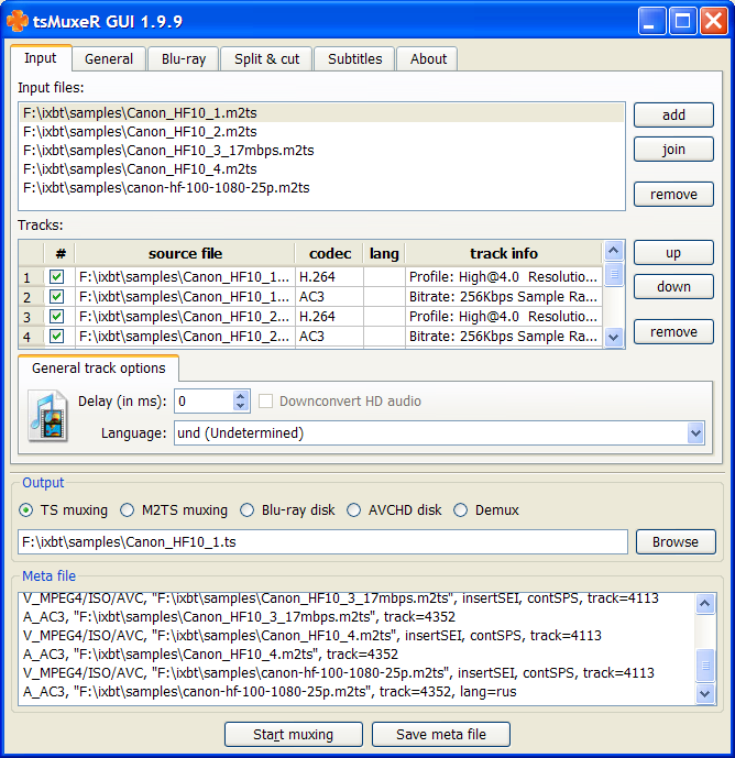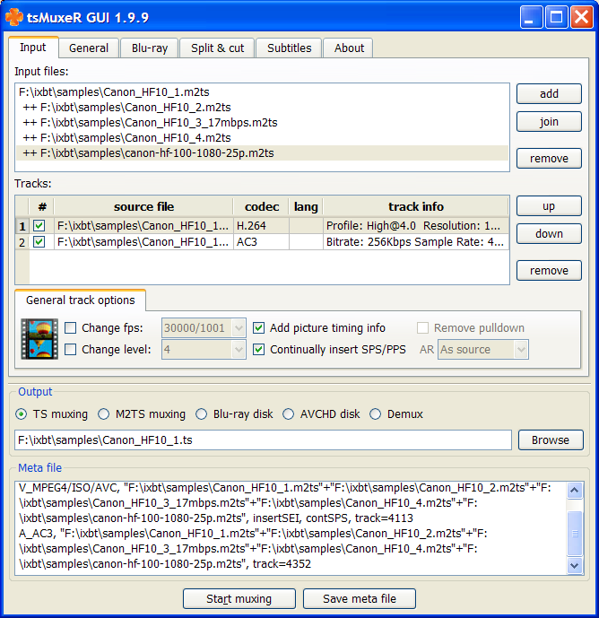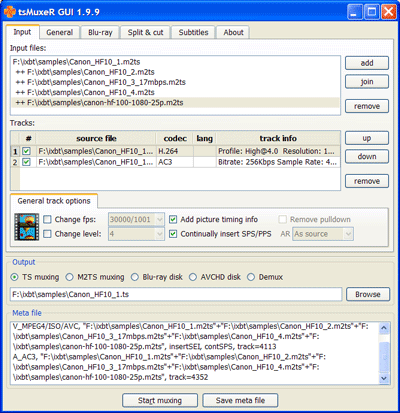 Если же необходимо осуществить обратную сборку, необходимо с помощью той же кнопки Add добавить элементарные потоки в список, выбрать выходной формат, указать выходную папку и нажать кнопку Start Muxing. При этом, можно собрать транспортный поток из произвольного количества видео- и звуковых потоков.