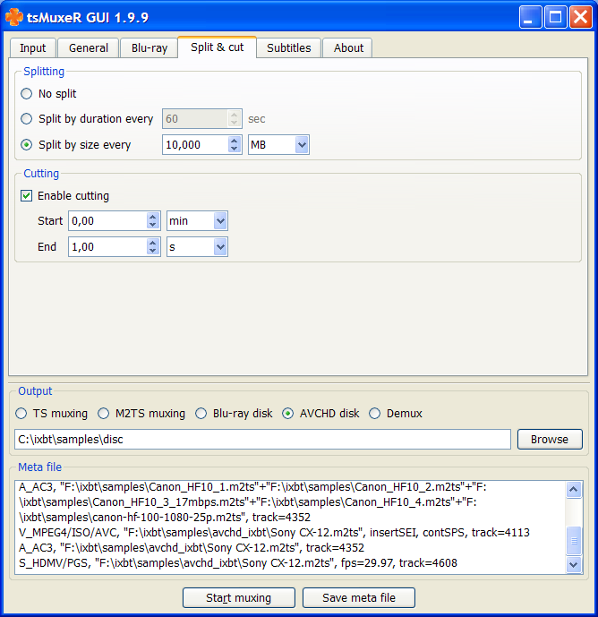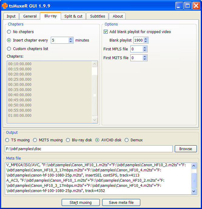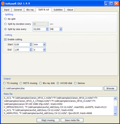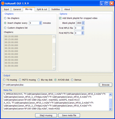В группе Output внизу окна осталось только выбрать выходной формат (например, AVCHD disk) и папку, в которую нужно поместить результат. После этого останется только нажать кнопку Start muxing и дождаться окончания процесса. При этом никакого пересжатия видео и звука не происходит, поэтому создание выходных файлов происходит довольно быстро (конечно, время зависит от объема входных файлов).