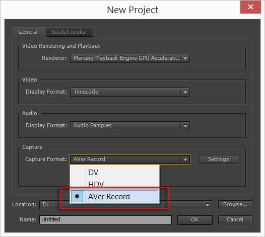 В Adobe Premiere Pro CS6 установленный плагин активируется совершенно иным образом, нежели в Sony Vegas. Все начинается с создания проекта. Здесь, в выпадающем списке Capture Format, следует выбрать параметр AVer Record.