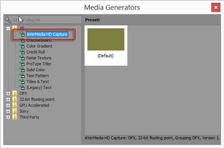 В Sony Vegas Pro v12 проверить доступность плагина можно следующим образом: вызвать панель Media Generators, и если в списке All присутствует генератор с названием AverMedia HD Capture — значит, все в порядке, плагин работает!