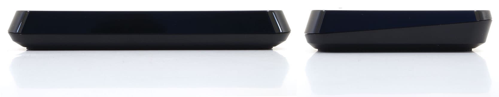 Под прозрачной продолговатой вставкой на крышке корпуса расположен синий светодиод, включающийся при наличии питания. Отметим любопытное свойство аппарата: полное отсутствие вентиляционных щелей. Ни спереди, ни с боков их нет. Возможно, их роль могут играть порты ввода-вывода, традиционно расположенные с торца. Но результат впечатляет: во время долгой работы корпус устройства не нагревается выше 40 °C.