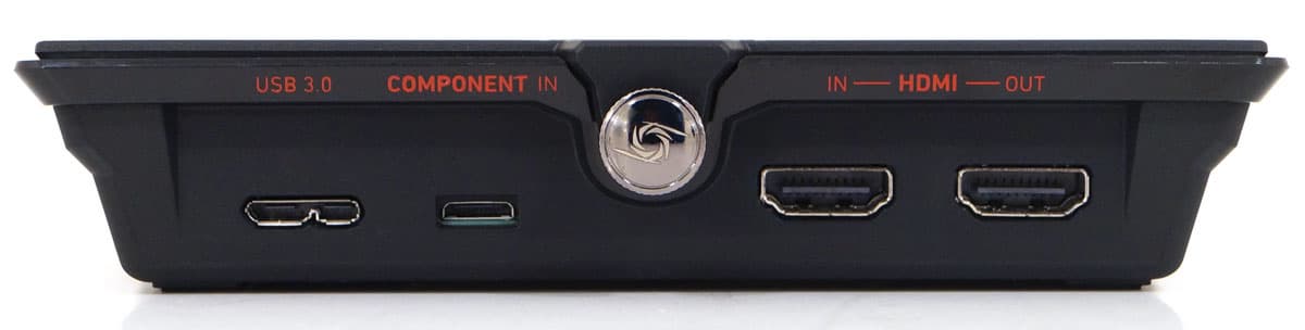 Корпус устройства изготовлен из шероховатого черного пластика с небольшим количеством черных глянцевых вставок. Своеобразный угловатый дизайн характерен для игровых продуктов AverMedia, как и черно-красная расцветка. Трапециевидная светлая полоска, находящаяся на стыке лицевой панели и крышки — это двухцветный светодиодный индикатор, который своими перемигиваниями сигнализирует о текущем состоянии устройства. Есть тут и еще одна характерная для продуктов компании деталь — некая изюминка, которая не имеет непосредственного отношения к функциональности, но, тем не менее, увеличивает привлекательность в геймерском мире. Видите прозрачное окно с рисунком под «стеклом»? Это она и есть, деталь. Чуть ниже мы расскажем о ней.