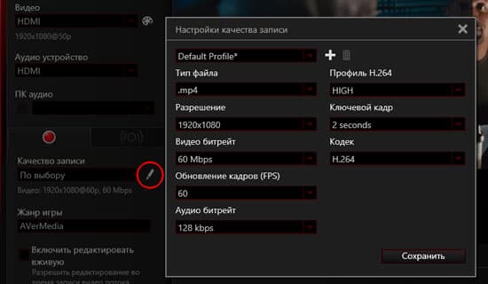 Помимо этого элементарного выбора, здесь же, в боковой панели, имеется возможность настройки качества записи. Оно определяется не только размерами и частотой кадров и битрейтом, но и также профилем кодека H.264, что является довольно важным параметром. Лучше бы, конечно, оставить как есть по умолчанию, наивысший профиль High.