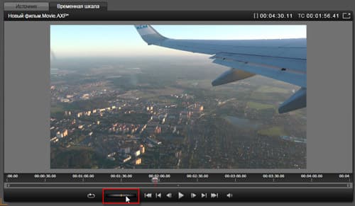 Не менее гибко производится и масштабирование таймлинии. Для этого в нижней её части имеется специальная полоса с передвижным маркером, границы которого можно раздвинуть мышью. Тем самым масштаб отображения проекта на таймлинии уменьшается либо увеличивается.